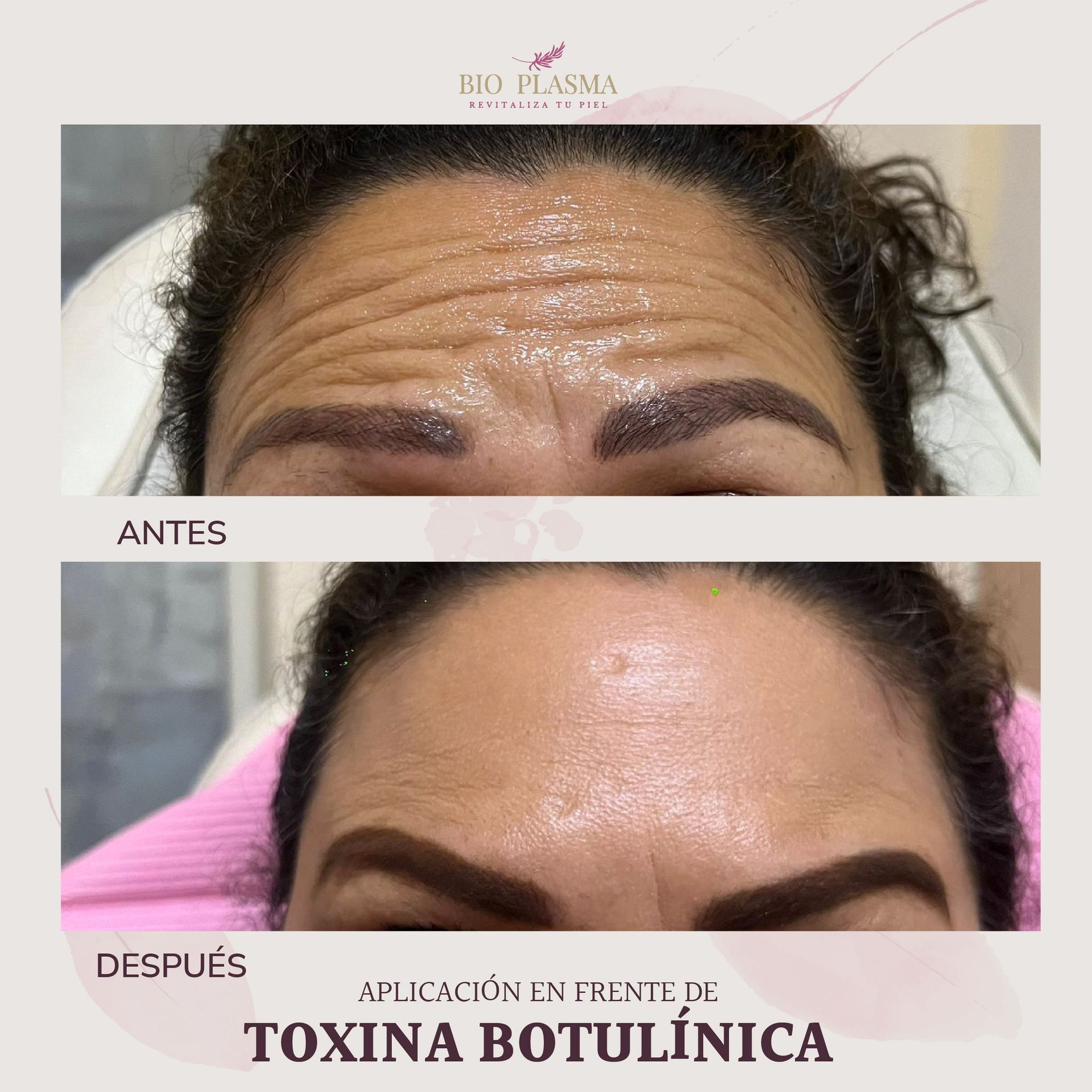 Aplicación con inyecciones faciales intramusculares de 50 unidades de toxina botulinica en la frente, entrecejo, zona periocular ("patas de gallo") y arrugas de la nariz. Posteriormente aplicamos una mascarilla relajante.